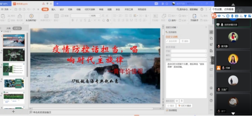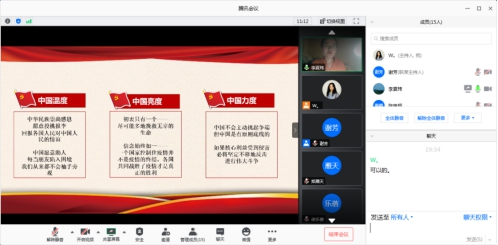 身处各地员工党员们围绕主题精心选材、撰写文稿、制作PPT,结合图片、音视频、诗歌等多种方式,从国家与国际、国家与人民、国家与自己等多个方面,深刻阐述了在全球面临百年未有之大变局时,中国向世界展示出的中国力量、中国气度、中国担当。其中,来自本科生三支部的王贤思同志在此次抗击疫情中,充分发挥所学专业,志愿协助完成越南语相关的医疗物资检验和海外捐赠物资对接工作,展现了员工党员肩负起党员的责任与担当,以绵薄之力为国家抗疫做出贡献;来自本科生一支部的李思宇同志,从自身社区疫情防控志愿者的经历,深刻体会到中国共产党的领导和中国特色社会主义的优越性,充分肯定在抗击疫情中展现出的中国温暖、中国亮度、中国力度;来自本科第三党支部的入党积极分子窦佳伟同志以“疫情中的平凡与伟大”为题,以朗诵的形式展示了疫情中平凡而伟大的故事,以小见大,深刻诠释中国共产党的先进性和独特优势,展示了人民英雄的力量和伟大精神。