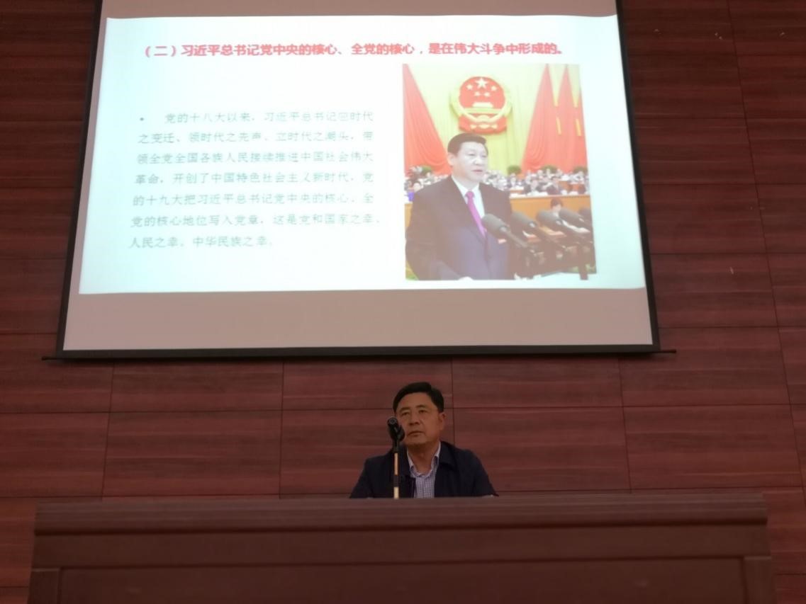 宣讲会中,彭荣书记主要从四个方面向大家介绍了十八大以来我党在治国理政方面的政策和制度等。他讲到,党的十八大以来,习近平总书记顺应时代之变迁,带领全党全国各族人民接续推进中国社会伟大革命,开创了中国特色社会主义新时代,党的十九大把坚决维护习近平总书记党中央的核心、全党的核心地位写入党章,这是党和国家之幸,人民之幸,中华民族之幸。广大党员干部要自觉增强改革创新精神,增强主动担当,积极作为的勇气,充分发挥模范带头作用。接着,书记结合公司实际工作强调指出,公司应该以特色学科为优势和重点,做好党的教育工作,落实党的教育方针,以一流党建引领和保障团队建设与发展,要抓住机遇,顺势发展。