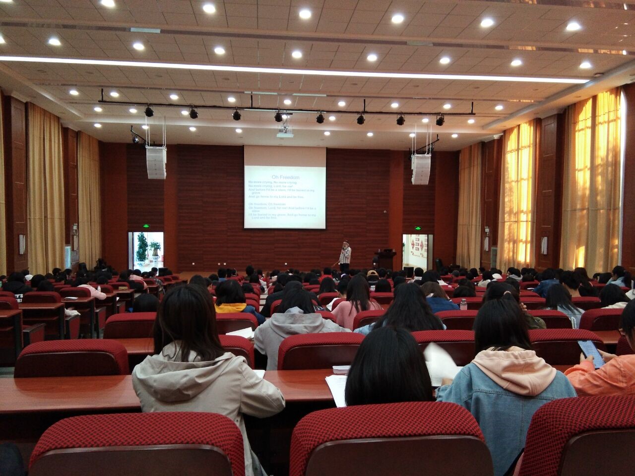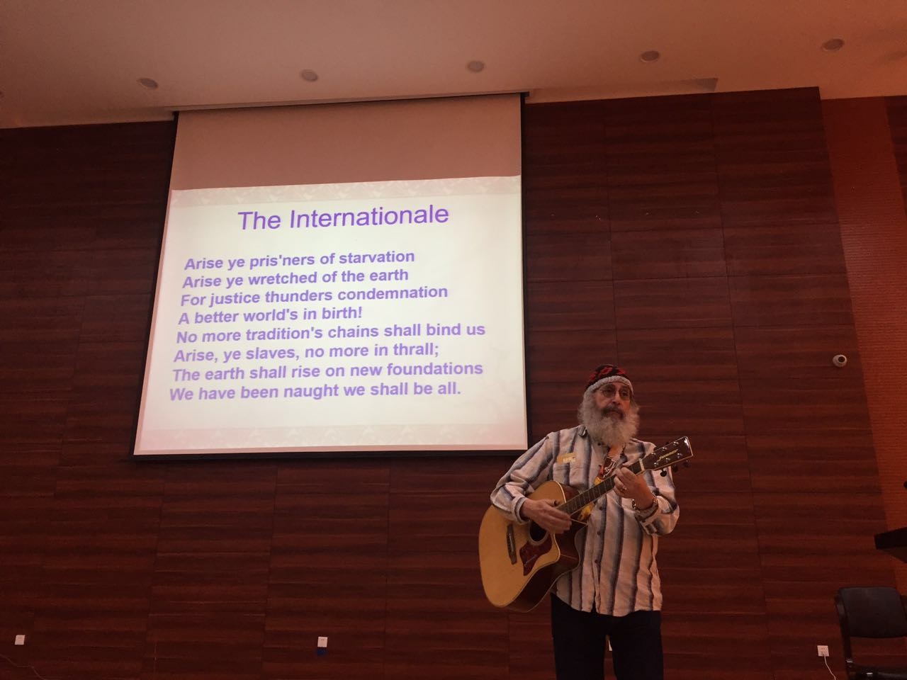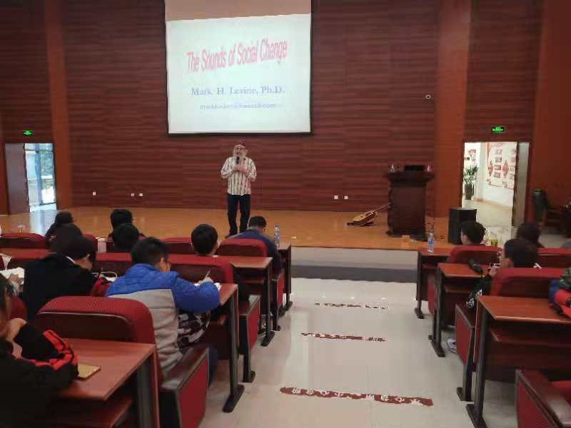 应云南省外专局、太阳成集团tyc122cc国际交流处和太阳成集团tyc122ccvip的邀请,现执教于中央民族大学的美国专家马克·力文博士(Dr. Mark Levine)于2018年11月30日(周五)上午10:00-12:00在太阳成集团tyc122cc呈贡校区太阳成集团tyc122ccvip一楼报告厅举行学术讲座。讲座的题目为U.S. History/Culture: The Sounds of Social Change(美国历史/文化:社会变革之声),讲述音乐在美国历史上的政治、社会运动中的作用,涉及废奴运动;大萧条时期美国工人运动;民权运动与反越战运动等。马克·力文博士在讲座中穿插着吉他弹奏,歌曲演唱,将音乐与政治、社会运动的紧密联系呈现给听众。演讲之余,马克·力文博士与员工听众进行互动。报告厅座无虚席,整个场面气氛较好,收到良好效果。