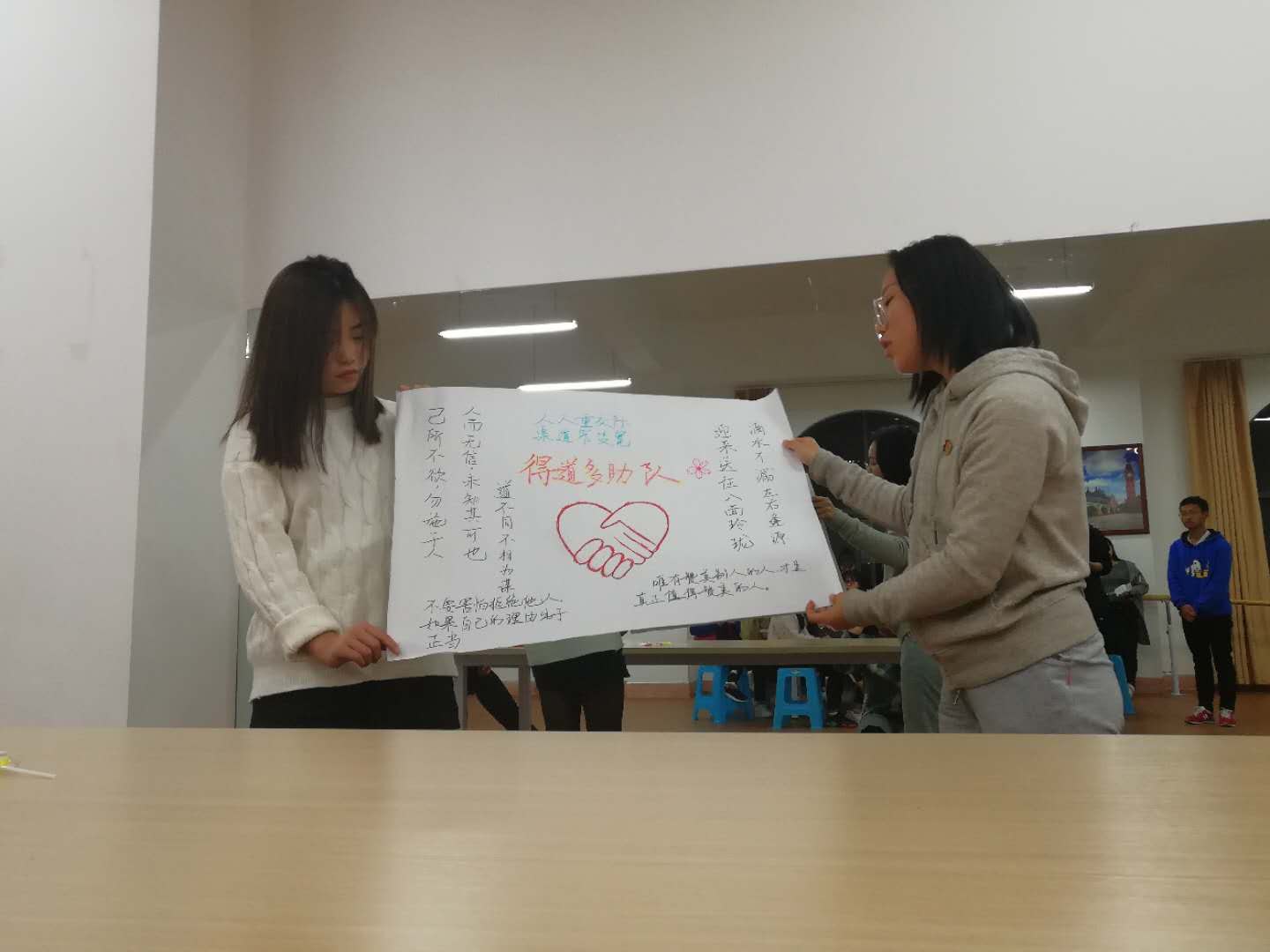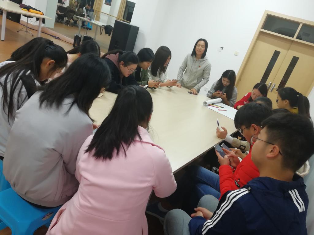 对于3个组,杨老师分配了不同的任务,首先让他们在2分钟之内讨论在职场中最重要的两个能力,各组各抒己见,有人际交往能力的,应变能力的,处理矛盾能力的,沟通能力的,个人能力的,大家各抒己见。针对大家的答案,杨老师给每个组选定了相对的主题,分别为人际交际能力,应变能力能力,专业技能,每个组分配一大张白纸,8支彩笔。由于第一组在活动开始时最先讨论出答案,可以享受最近的桌子椅子,另外两个组则要自己动手。第三组立马动手,第二组则要老师提醒才会行动。结果最后,第一组和第三组全部成员都有桌椅,但二组的部分同学只能站着。针对这个情况,杨老师适时提出在职场中资源是有限的,所以要自己积极主动争取做资源的拥有者与占有者。每个组在20分钟内,设计队名、口号,每人书写一句与主题相关的短句或词组等。计时开始,有的组开始分工,明确各自的任务,有的组开始查资料。在这个过程中,杨老师与两位观察员对各个组进行观察。时间结束后,每个组依次上台展示成果,每个组有各自的特色。从海报排版,内容的匹配度,讲解情况等考虑,杨老师选出了最优秀的一个组,并给他们送出数据线,湿纸巾等礼物。针对同学们的提问,杨老师积极解答,并提出了一系列建议。