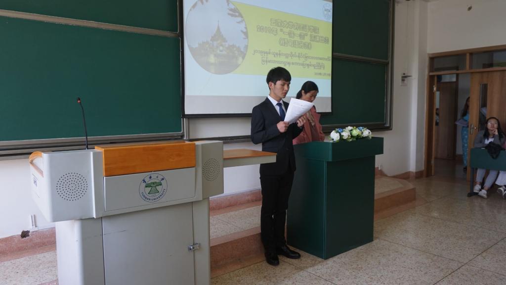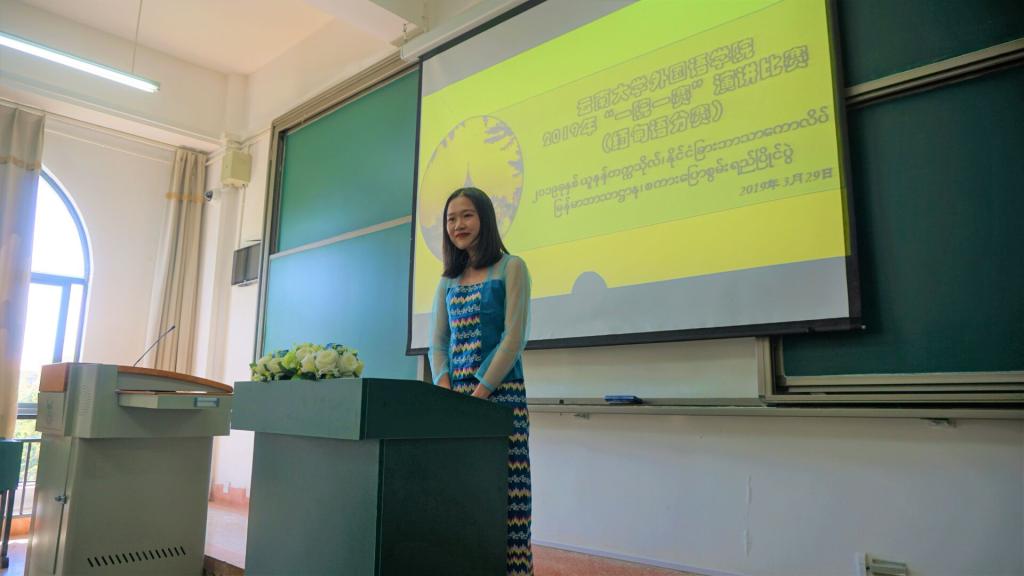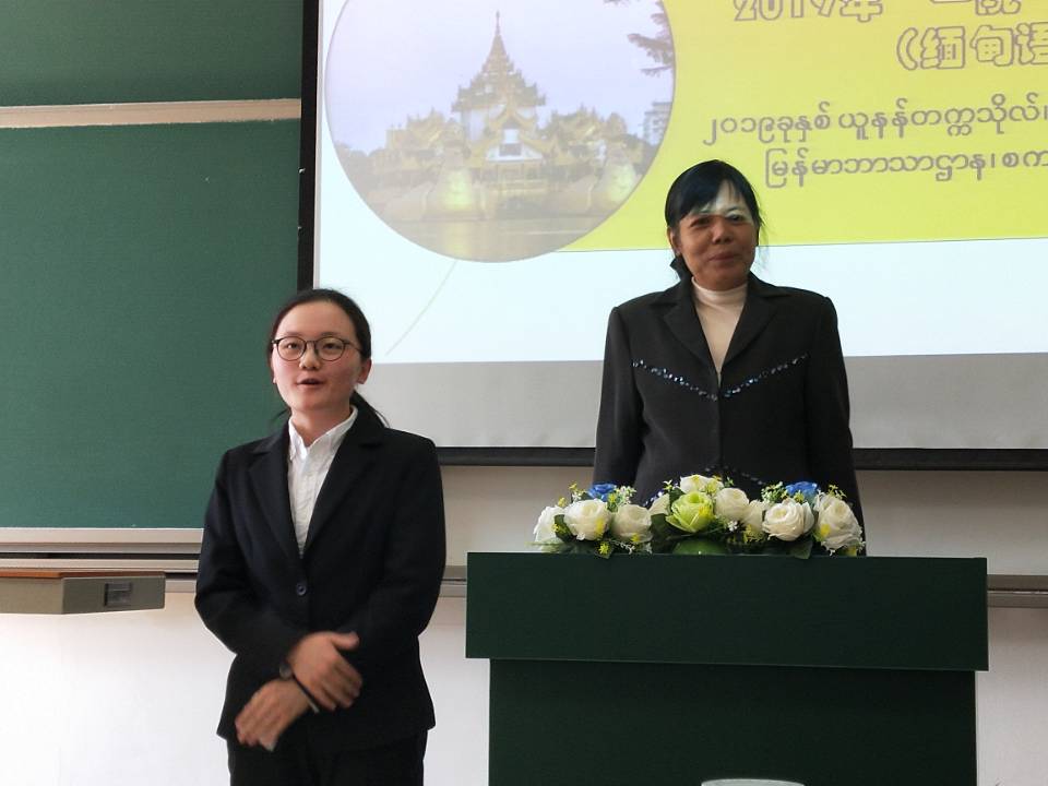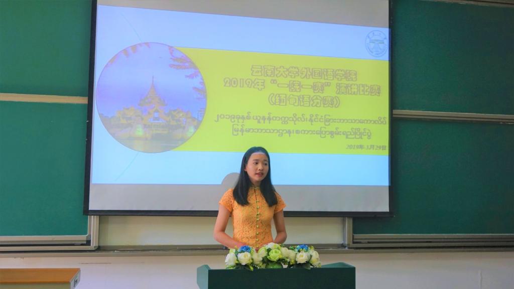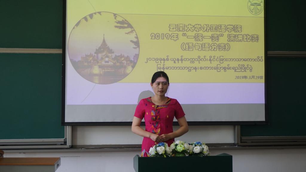 缅甸语系系主任李堂英老师为本次比赛致辞,鼓励同学们展示缅甸语专业员工的精神风貌,敢于不断地挑战自我和超越自我,表扬同学们在缅甸语学习中的努力勤奋,并预祝本次演讲比赛圆满成功。