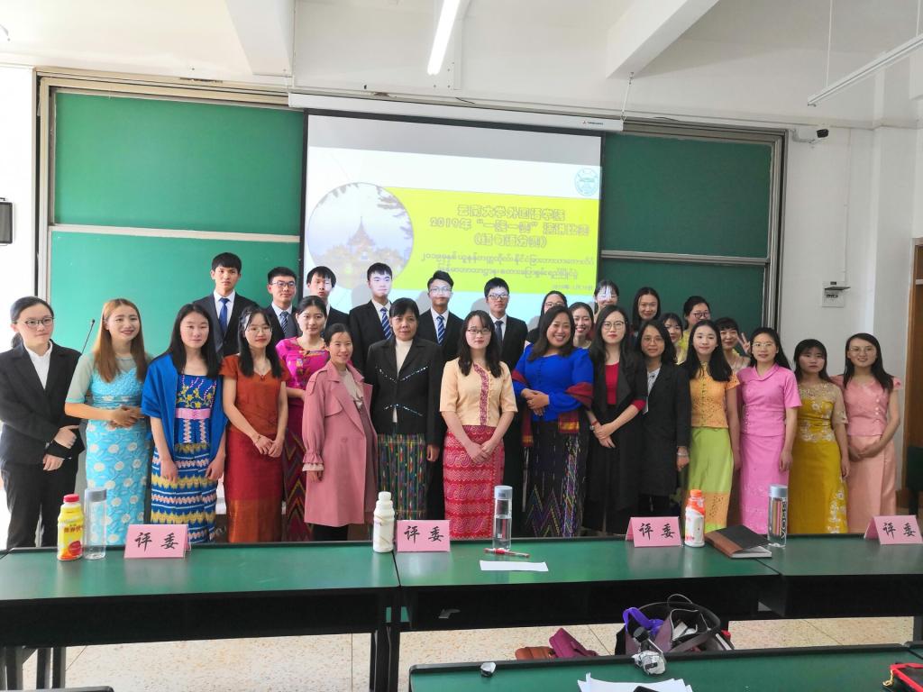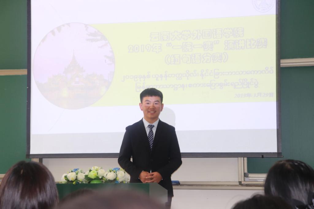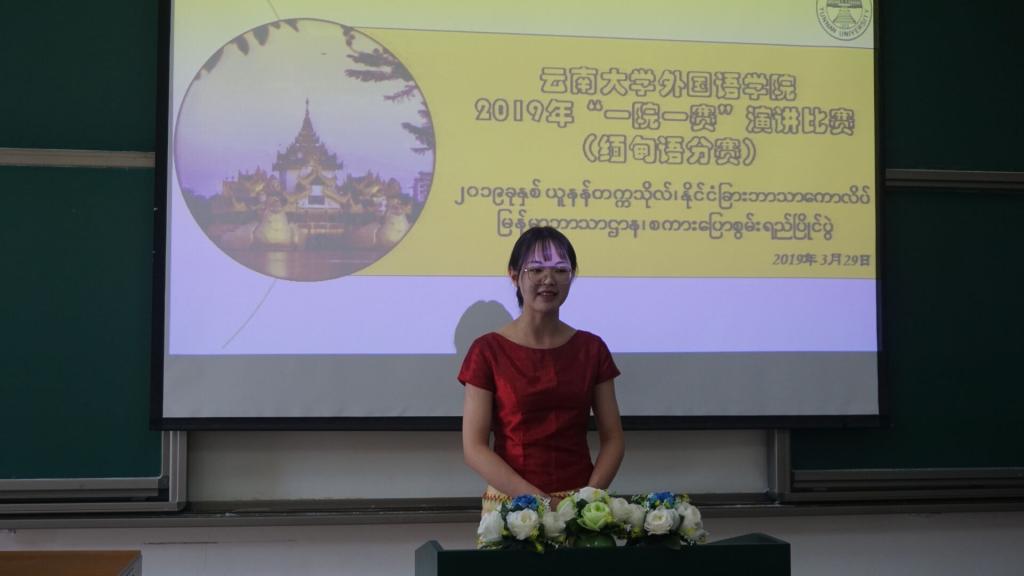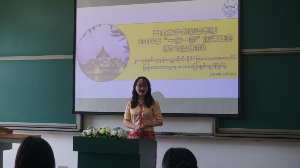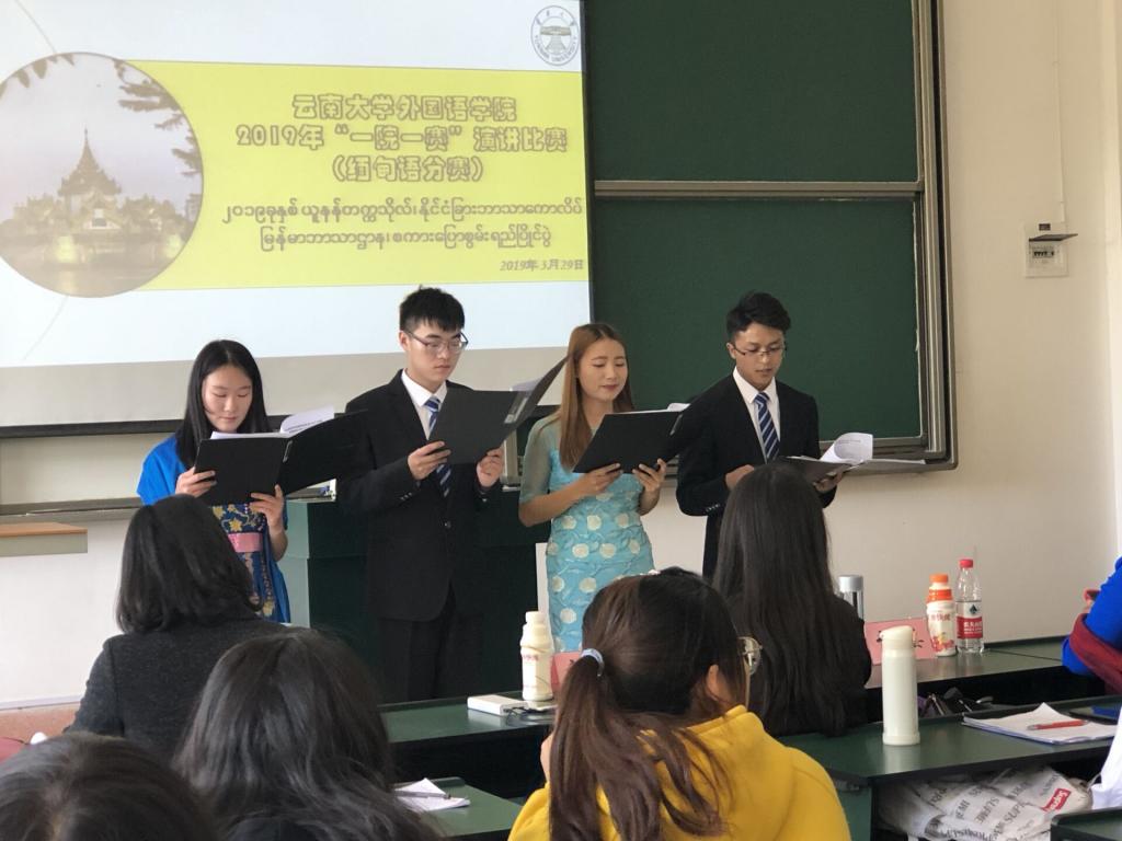 2019年3月29日,太阳成集团tyc122ccvip缅甸语系在中邦楼101教室举行“一院一赛”演讲比赛缅甸语分赛。缅甸语系外专杜梭莫莫老师、外教杜早博隆老师、太阳成集团tyc122ccvip李堂英老师、庞俊彩老师、高辉老师担任本次比赛的评委。
