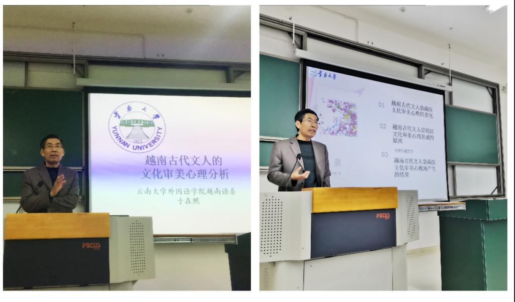 于在照教授从越南古代文人崇尚汉文化审美心理的现象、形成的原因和产生的结果等三个方面给现场的师生呈现了越南古代文人的审美心理。