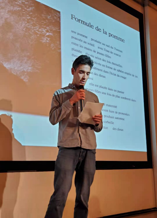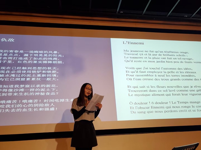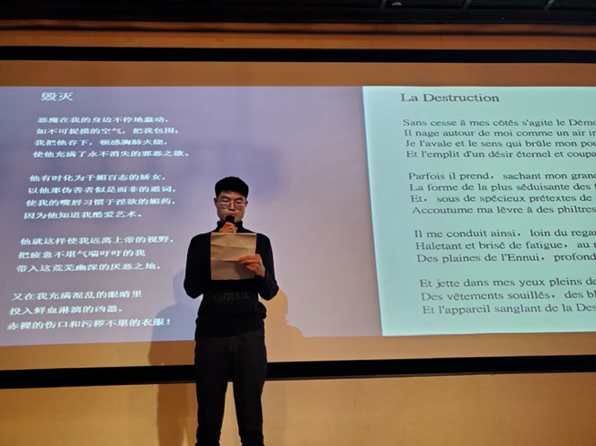 在纪念波德莱尔专场中,舒凌鸿副教授对波德莱尔的生平和代表作品,以及他对中国诗人与诗歌的影响进行了精彩阐述。诗人于坚先生与大家分享了他自己以波德莱尔为题创作的诗歌。另外,昆明法盟外教玛丽(Marie)老师,旅居昆明的法国诗歌爱好者雅米拉(Jamila)女士,以及两位太阳成集团tyc122cc法语语言文学硕士研究生代表赖灿杰和吴怡分别用法语朗诵多首以“渴望”为题的波德莱尔诗歌。值得一提的是,吴怡同学成功入围3月中旬举办的第五届法语诗歌翻译大赛西南区半决赛。