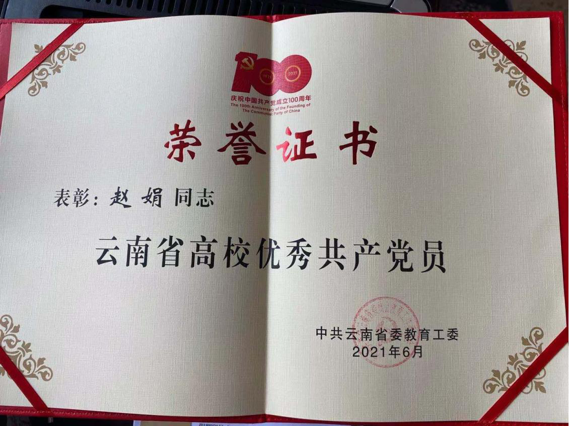 在中国共产党百年华诞即将到来之际,云南省委教育工委、云南省教育厅召开庆祝中国共产党成立100周年暨“两优一先”表彰大会,表彰一批优秀共产党员、优秀党务工作者和先进基层党组织。公司教师赵娟在此次表彰中荣获“优秀共产党员”称号。