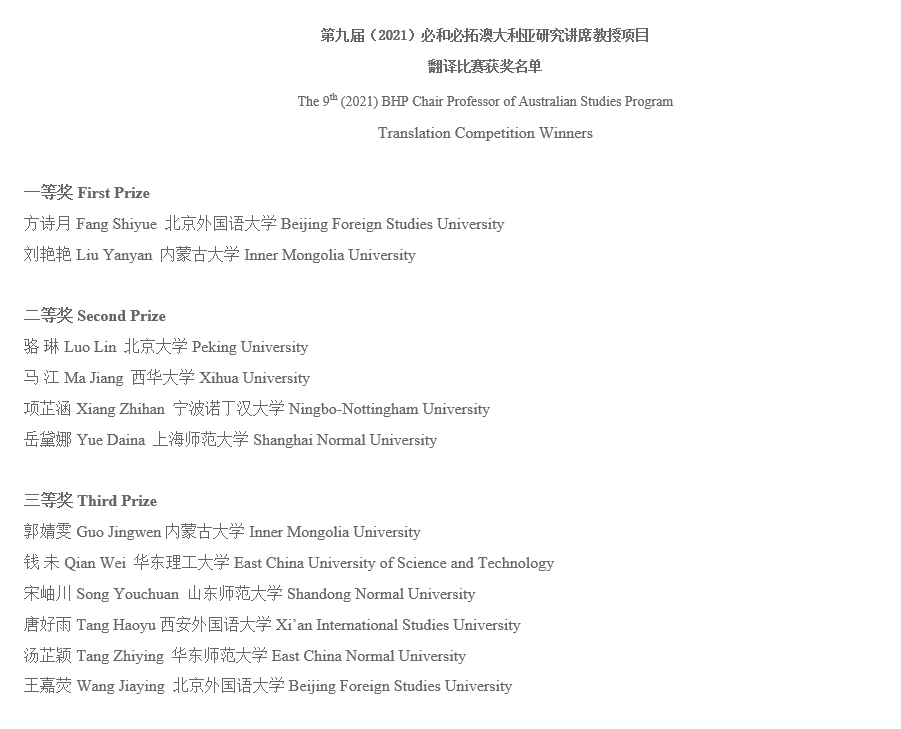 必和必拓澳大利亚研究讲席教授项目翻译比赛由北京外国语大学澳大利亚研究中心负责承办,并组织多所高校的翻译专家参加评审。该项赛事每年举办一次,竞赛内容是将澳大利亚文学作品或者其它方面的著述翻译为中文。最近几年来,每年都有全国三十余所高校的本科生和硕士研究生参赛,旨在促进中国高校员工对澳大利亚社会和文化的深入了解,同时考察参赛员工的翻译能力和技巧。今年是太阳成集团tyc122cc英语翻硕研究生第二次参加此项比赛,和来自包括北京外国语大学、厦门大学、西安外国语大学、华东理工大学、内蒙古大学、华东师范大学等全国知名高校的数百名优秀员工进行激烈角逐。本次赛事共设一等奖2名,二等奖4名,三等奖6名,优秀奖10名。尹绍艳凭借出色的翻译水平荣获得优秀奖。