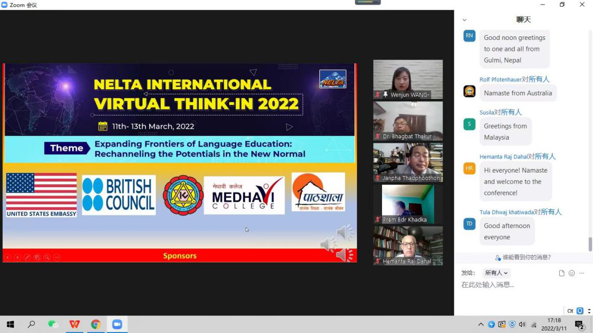 2022年3月11日,公司英语系研究生公共外语教研室主任王文俊副教授,经国际英语教育(TESOL)中国大会选拔与推荐,作为特邀嘉宾参加尼泊尔英语教育协会(NELTA)在线国际会议,并做主旨发言。