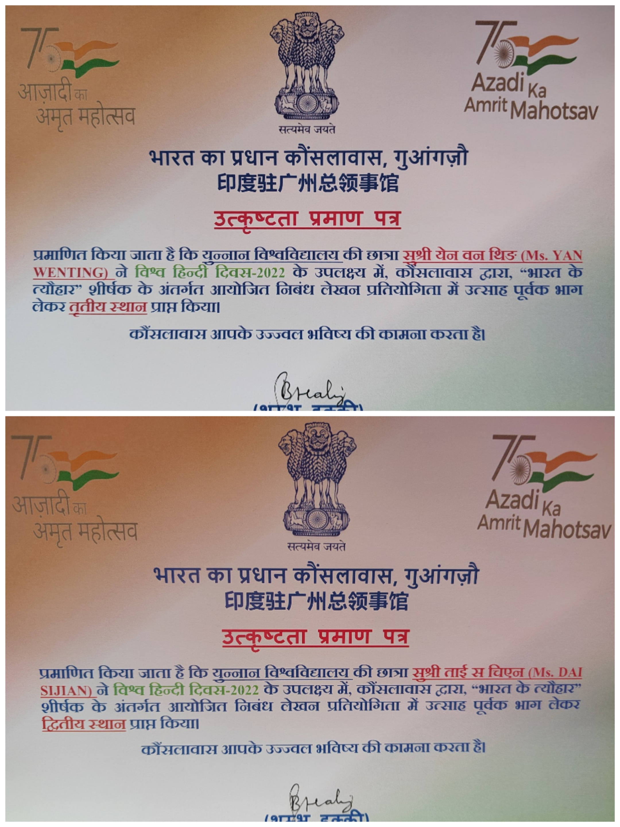 2022年3月31日,由印度驻广州总领事馆举办的2022年度“世界印地语日”庆祝活动暨大赛表彰大会在线上举行。我院印地语专业2019级员工代思佳和严文婷在征文大赛中分别斩获二等奖和三等奖。