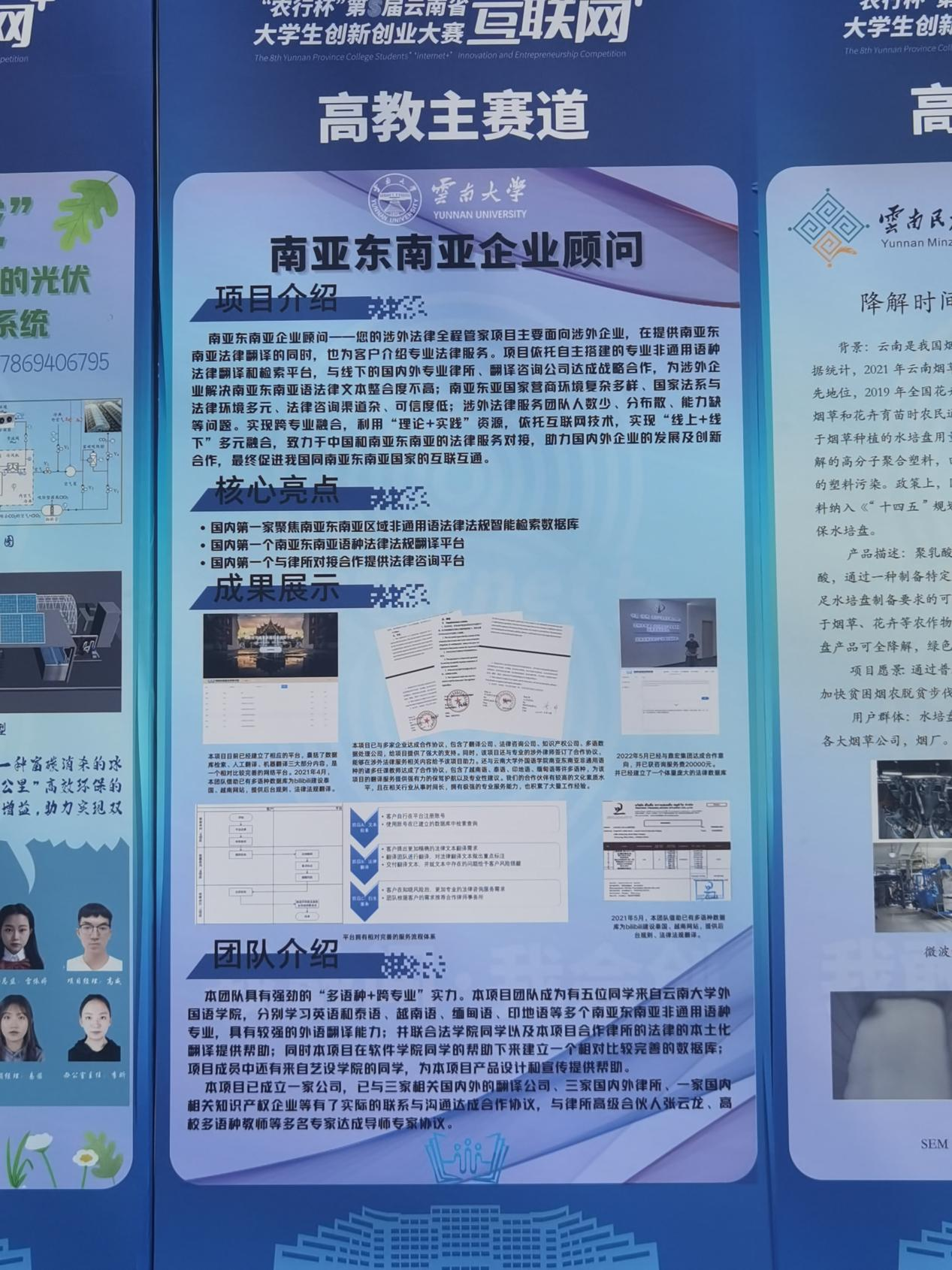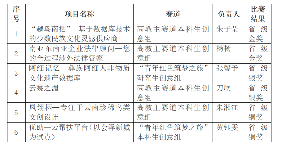 进入7月的省内评审阶段,公司6个晋级省赛的项目均顺利通过省内初审。其中高教主赛道的《“越鸟南栖”—基于数据库技术的少数民族文化灵感供应商》、《南亚东南亚企业法律顾问—您的全过程涉外法律管家》项目和“青年红色筑梦之旅”赛道的《阿细记忆—彝族阿细人非物质文化遗产数据库》项目入围省级金奖争夺赛现场路演决赛。
