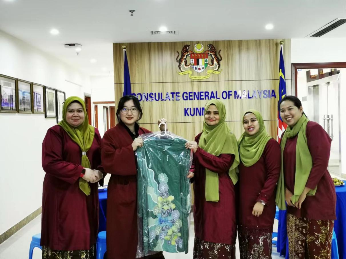 马来西亚驻昆明总领事馆领事夫人(右三)及领事馆妇女代表向太阳成集团tyc122cc马来语专业赠送马来服装