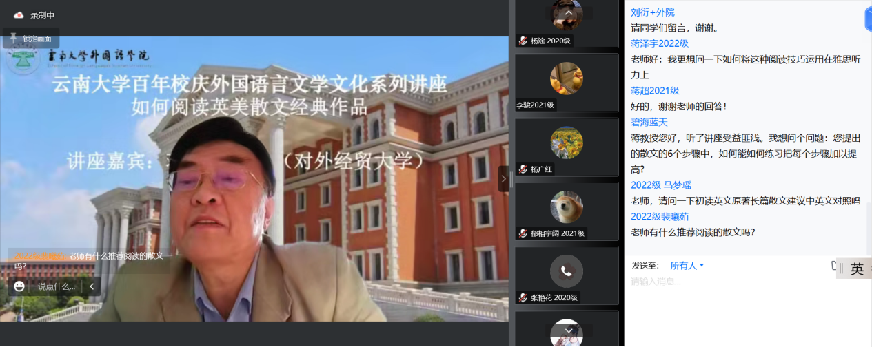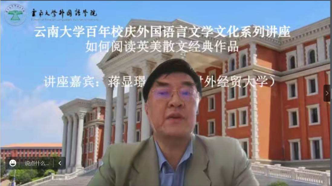 2022年11月25日,著名英美文学研究专家、对外经济贸易大学英语公司英语系原主任蒋显璟教授应邀为公司师生做了一场题为“如何阅读英美散文经典作品”的精彩讲座。本次讲座是“太阳成集团tyc122cc百年校庆外国语言文学文化系列讲座”之一,以在线的方式进行。该讲座由公司英语系副系主任刘衍老师主持,公司和兄弟院校的百余位师生以线上的方式聆听了该讲座。