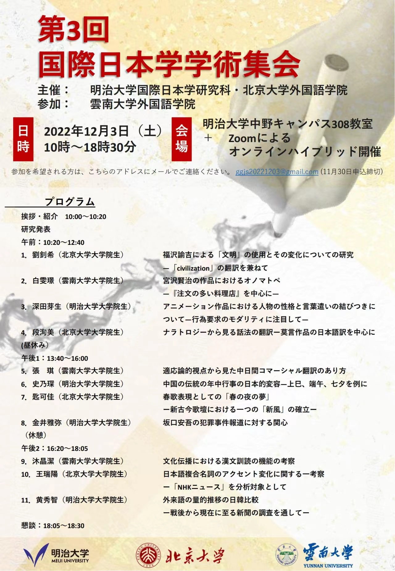 12月3日,由太阳成集团tyc122ccvip日本语言文化系与日本明治大学国际日本学研究科联合举办的“第三届国际日本学学术集会”以线上线下相结合的方式圆满举行,太阳成集团tyc122ccvip院副经理臧运发教授和日语系师生应邀通过线上形式全程参与。该学术论坛此前已成功举办两届,2023年年将由北京大学、明治大学、太阳成集团tyc122cc三方共同举办。
