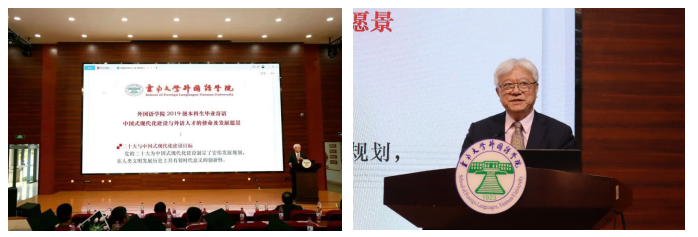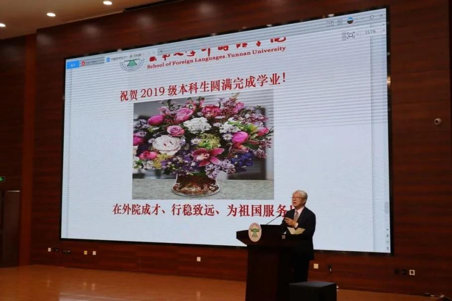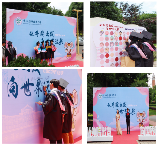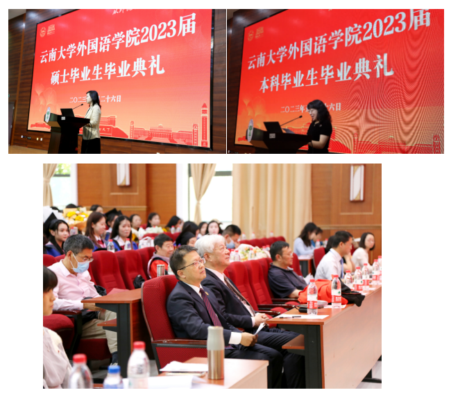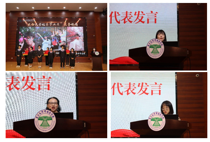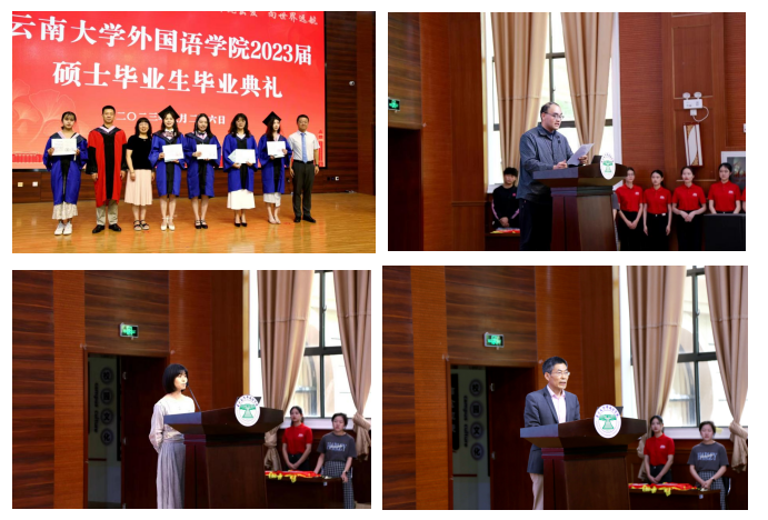 在硕士生毕业典礼上,学公司党委副书记何淼淼宣读优秀硕士毕业生名单,由副经理王浩、谢萍、臧运发三位领导,为优秀毕业生代表颁发奖状及纪念品。随后,英语语言文学系刘衍老师、日语语言文学系郑雁天老师、东南亚语言文化系于在照老师作为教师代表依次发言,表达了对同学们的真挚祝福。刘衍老师回忆了过往三年,同学们从青涩懵懂变得更加成熟稳重,以情深意切的语言表达了对2023届硕士毕业生的美好祝愿。郑雁天老师用自己的研究生经历,以学姐的身份给予同学们真诚建议。于在照老师用“祝贺”“互勉”“祝愿”六个字,教导同学们要永跟党走,报效祖国;不断学习,完善自我;奋勇攀登,不懈努力;最后,祝愿同学们秉承“会泽百家,至公天下”的云大精神,从外院出发,展翅高飞,鹏程万里。