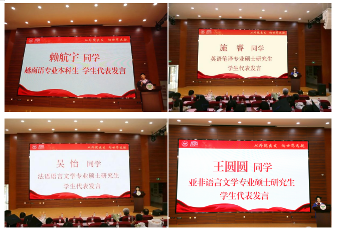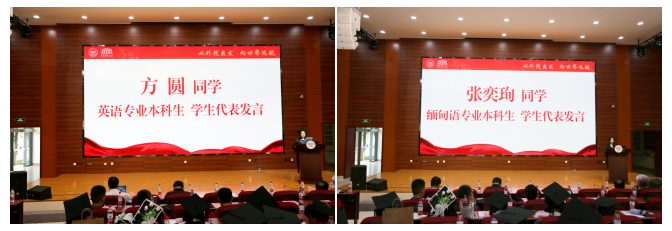 教师代表发言后,2019级英语专业本科生方圆、2019级缅甸语专业本科生张奕珣、2019级越南语专业本科生赖航宇作为本科生代表,2020级英语笔译专业硕士研究生施睿、2020级法语语言文学专业硕士研究生吴仪、2020级亚非语言文学专业硕士研究生王圆圆作为硕士生代表依次上台发言。六位同学分享了在太阳成集团tyc122ccvip期间的收获与成长,表达了内心的不舍和对未来的期待,为毕业生们送上祝福。