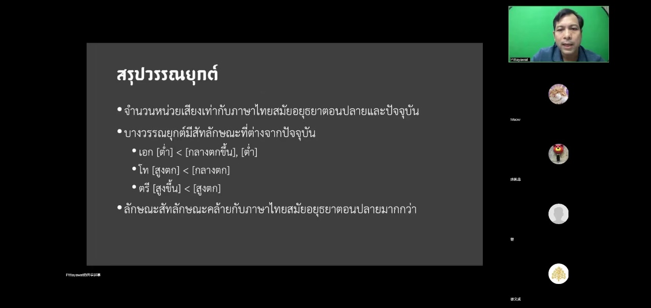 Pittayawat副教授的讲座分析了泰国曼谷王朝初期(拉玛一世——拉玛四世时期)的泰语语音系统,认为曼谷王朝初期的泰语辅音系统与阿瑜陀耶王朝末期及现代泰语辅音系统相同,而元音系统仅与素可泰王朝时期相似,但与现代泰语的元音系统有所差异。声调方面则与阿瑜陀耶王朝末期的泰语声调更为接近。