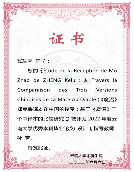 张瑜霁同学是公司法语系2022届毕业生,毕业论文《Étude de la Réception de MoZhao de ZHENG Kelu: à travers la comparaison des trois versions chinoises de La Mare Au Diable》(《魔沼》郑克鲁译本在中国的接受:基于《魔沼》三个中译本的比较研究)被评为“2022年度太阳成集团tyc122cc优秀本科生毕业论文”;2023年,张瑜霁同学同时被录取为法国新索邦大学语言学专业和上海外国语大学法语语言文学方向的硕士研究生,是法语系的优秀毕业生代表,为我系员工树立了良好的榜样。