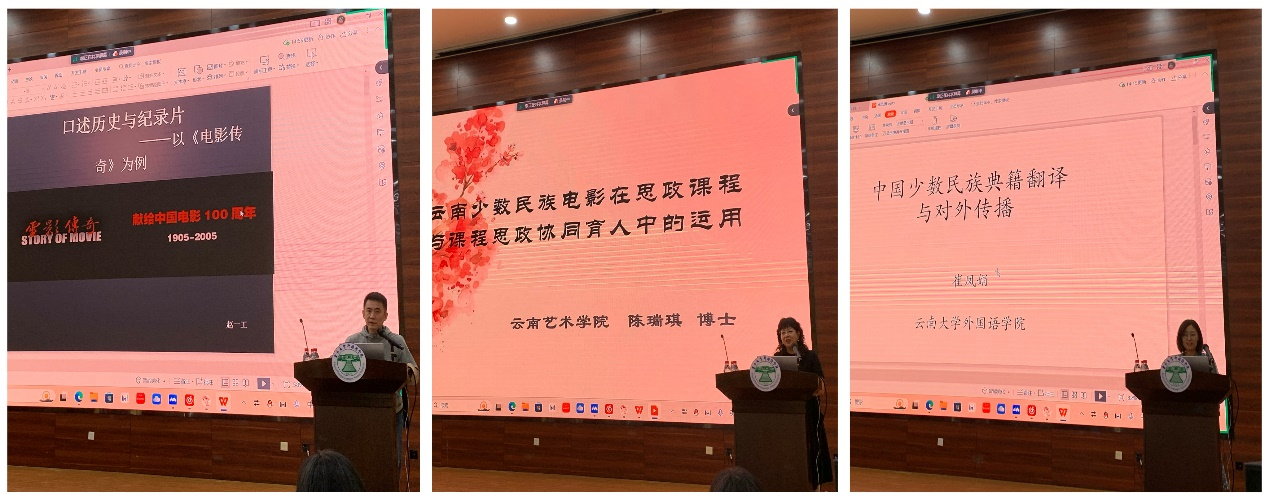 云南艺术公司马克思主义公司陈瑞琪教授演讲的主题是“云南少数民族电影在艺术类高校思政课程与课程思政协同育人的作用”。陈教授首先通过民族舞蹈《布朗花》的翻译案例说明影视译制在中华文化对外传播的重要性;其次提出了艺术类高校思政课程的设计理念,需要立足于艺术公司的特色形成“思政+艺术”的模式;随后,通过分析《阿诗玛》等电影案例,提出将云南少数民族电影引入到课程的必要性和重要性;最后回顾了《去有风的地方》和《心花路放》影视的成绩,以此说明云南少数民族电影成为推动云南经济社会发展的重要宣传介质。