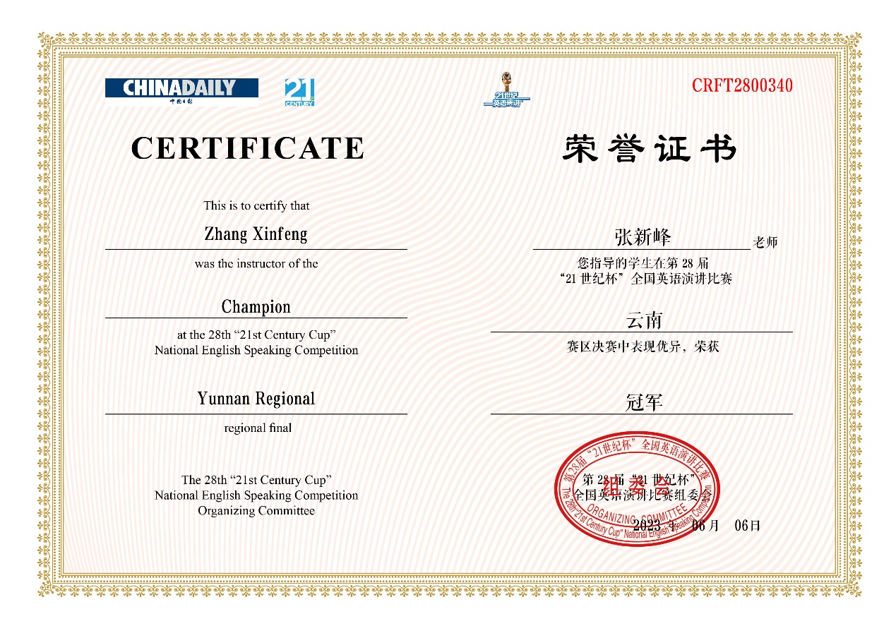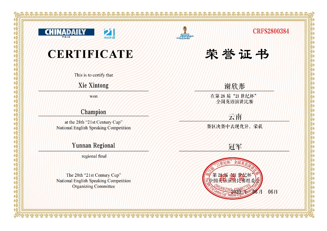 6月18日,第28届“21世纪杯”全国英语演讲比赛云南地区决赛在昆明文理公司落下帷幕。公司英语系张新峰老师指导的2021级本科生谢欣彤同学获得冠军,将代表云南省参加8月举行的全国总决赛。