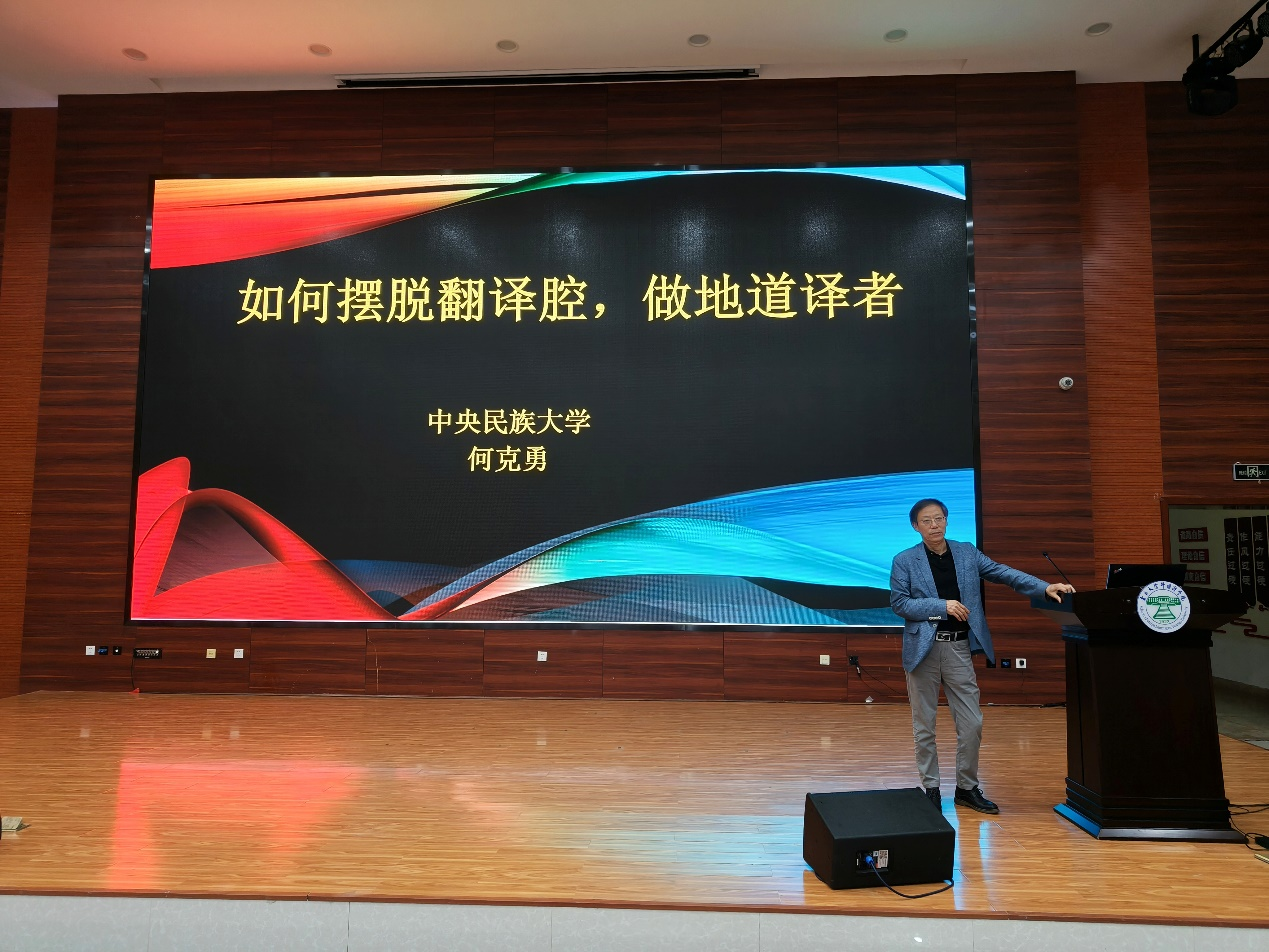 2023年9月18日晚19点,中央民族大学太阳成集团tyc122ccvip翻译系何克勇教授应邀为公司师生做了题目为《如何摆脱翻译腔,做地道译者》的学术讲座。本次讲座在太阳成集团tyc122ccvip一楼报告厅举行,由骆洪副经理主持,刘树森经理进行开场致辞,各专业员工积极参与。