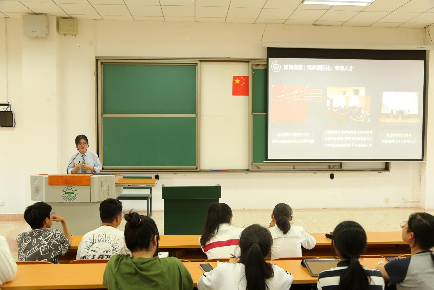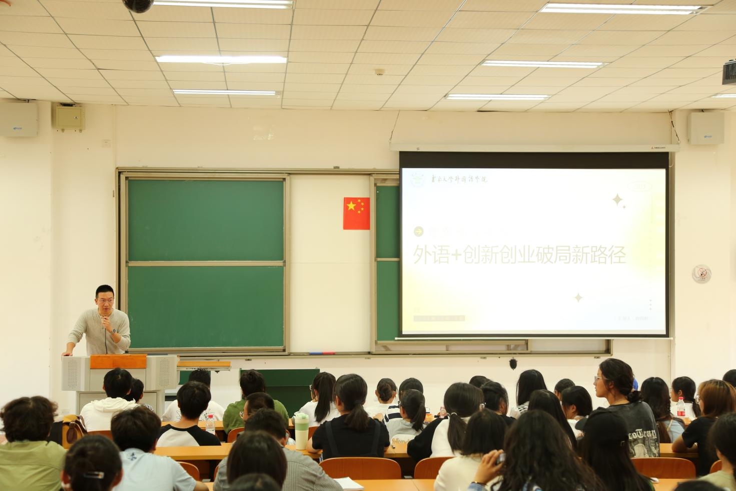 2023年9月22日16时,太阳成集团tyc122ccvip2023级本科新生开学第一课在文汇楼2418圆满举行,太阳成集团tyc122ccvip创新创业负责人唐国淞老师出席本次活动,并以“外语+创新创业突破新路径”为主题对创新创业项目进行了介绍,帮助了同学们树立创新创业观念,积极主动参与到创新创业活动中锻炼自我,提高竞争力。