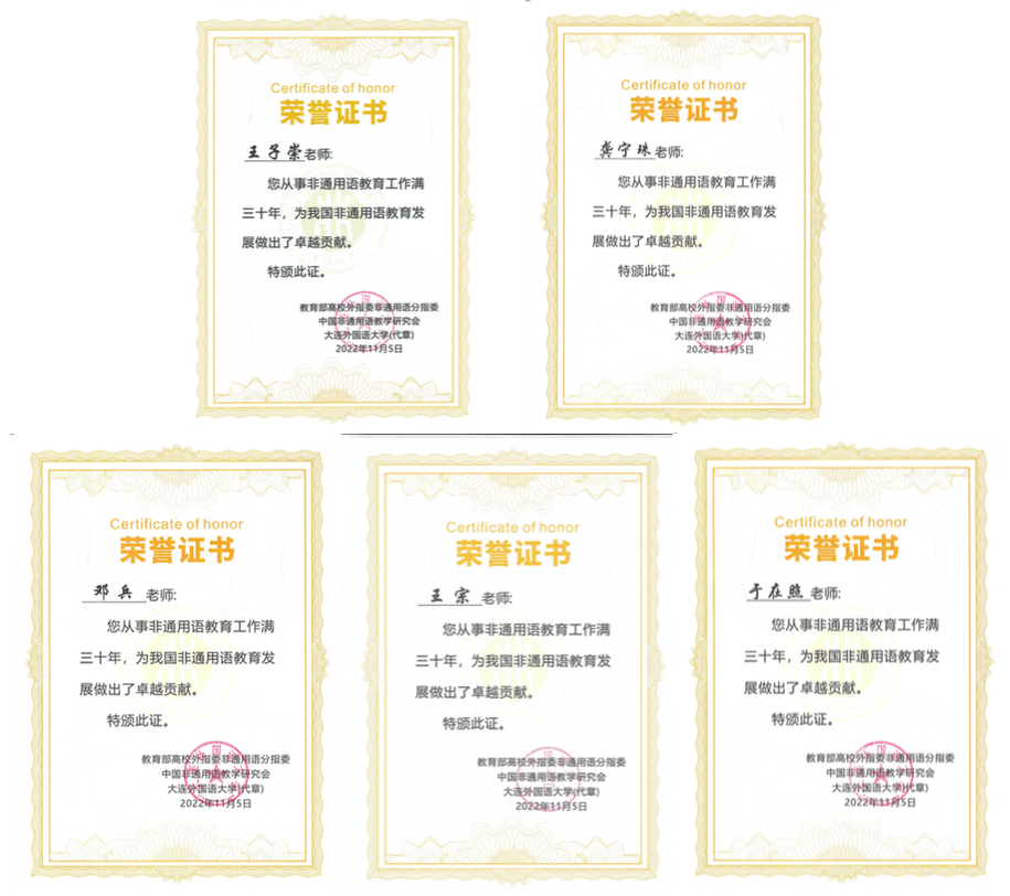 近日,公司邓兵教授、龚宁珠教授、王子崇教授、王宗教授、于在照教授五位教师荣获教育部高校外指委非通用语分指委、中国非通用语教学研究会颁发的荣誉证书,表彰他们从事非通用语教育工作满三十年,为我国非通用语教育发展做出的卓越贡献。