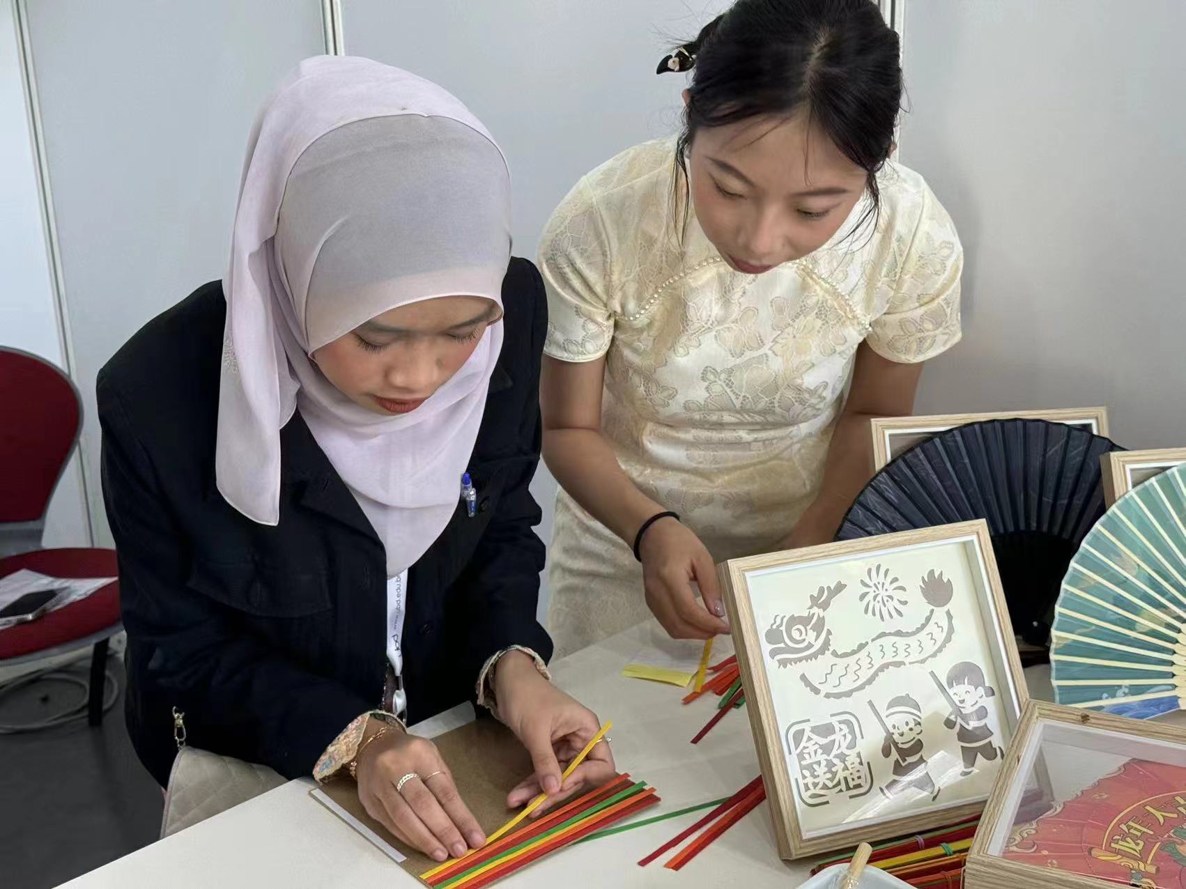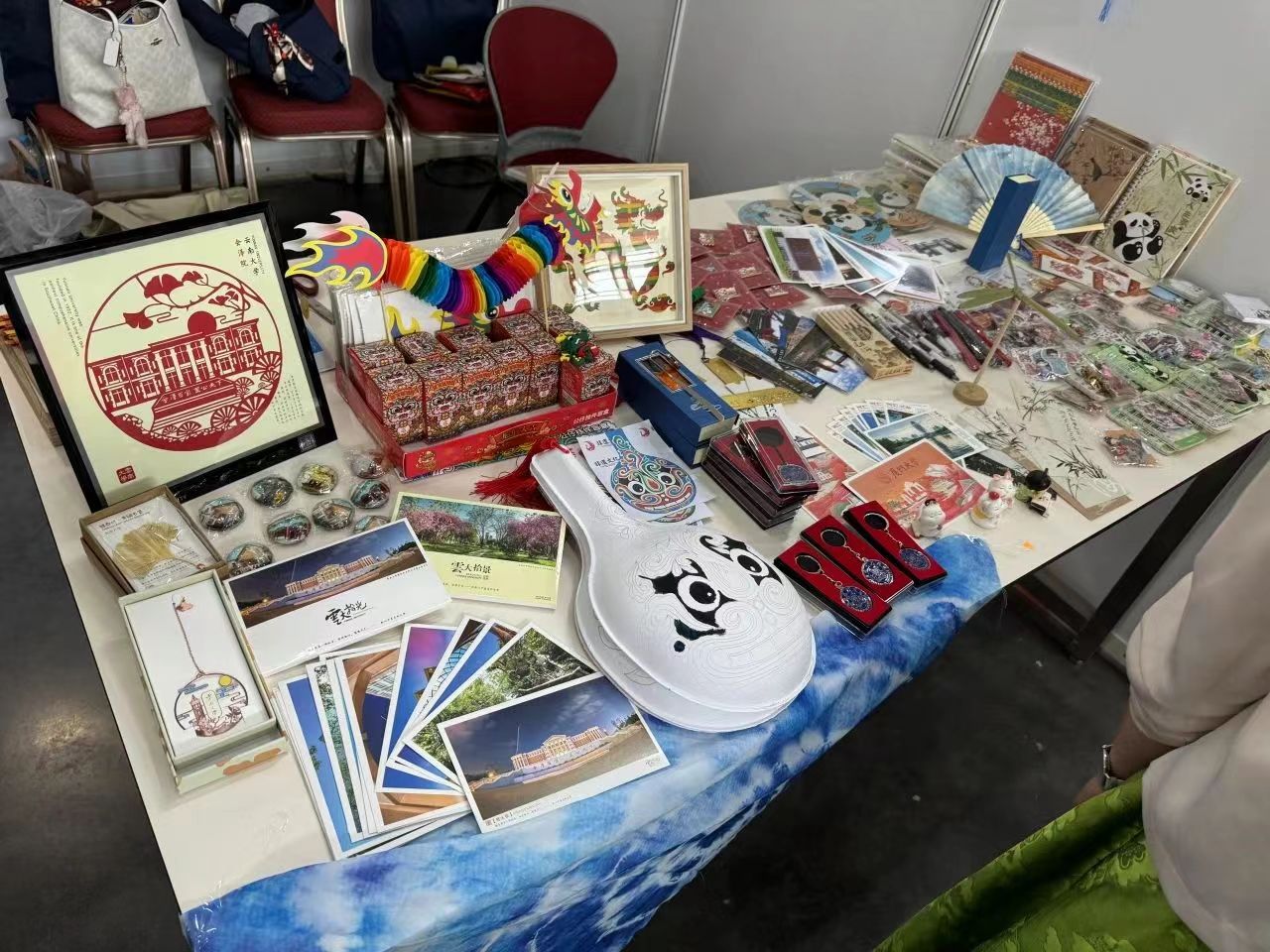 在艺术文化集市上,蕴涵中华传统文化和民族特色元素的文创产品在中国展位展出,吸引了各国青年驻足了解。靳梦璐同学向外国青年展示介绍了太阳成集团tyc122cc剪纸画、书签、明信片等文创产品,以及充满云南特色的扎染、中国非遗竹编画、手工拉花中国龙、艾草香囊等物件。其中,公司展出的唐朝湿拓画颇受欢迎,各国青年纷纷排队参与制作属于自己独一无二的湿拓作品。在和谐友爱的互动中增进各国青年的交流与了解,是对中国非物质文化遗产艺术瑰宝的有益传播。