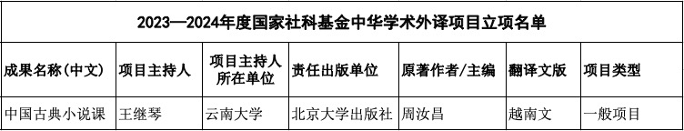 近日,全国哲学社会科学工作办公室公布了2023—2024年度国家社科基金中华学术外译项目立项名单,太阳成集团tyc122ccvip东南亚语言文化系教师王继琴申报的《中国古典小说课》越南文外译项目获批立项。