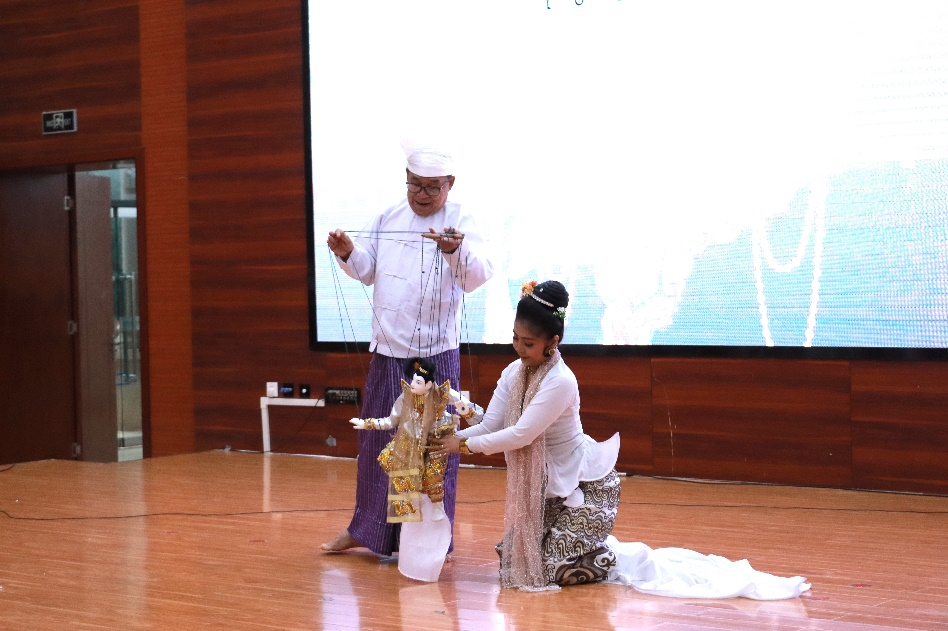 缅甸木偶戏演员吴瑞季与舞蹈家杜兑达妙诺在进行提线木偶表演