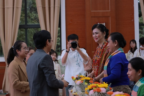 随后,缅甸访华艺术团团长吴貌貌佐特上台致辞,并对代表团成员进行了介绍。现场掌声热烈,大家对缅甸艺术团的到来充满了期待。吴貌貌佐特团长对中华优秀传统文化表达了由衷的赞美与敬仰,并祝愿中缅两国友谊长存,万古长青。