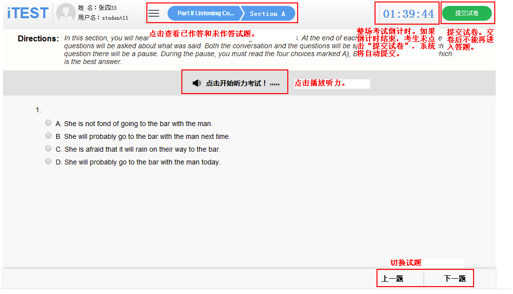 5. 考试时请注意时间分配,考试倒计时结束后,会自动收卷。