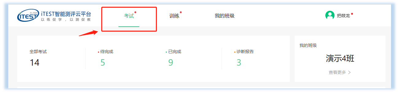 2)登录后,在“考试”页面,可以查看正在进行中的考试以及具体的考试科目、时间、时长。找到考试,点击“去考试”按钮。