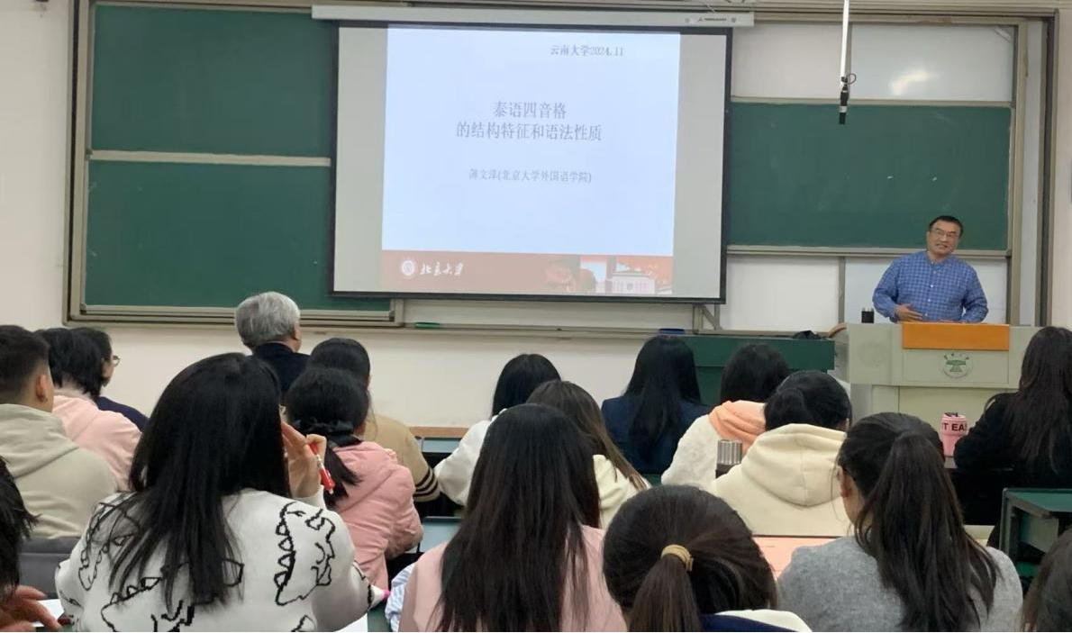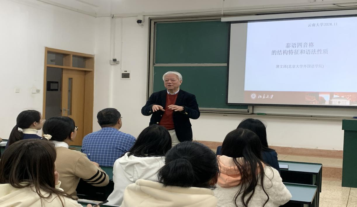 2024年11月26日,太阳成集团tyc122ccvip薄文泽教授应邀莅临公司进行题为“泰语四音格词语的结构特征和语法性质”的学术讲座。此次讲座为太阳成集团tyc122cc外国语言文学学科创新发展系列讲座的第11场,太阳成集团tyc122ccvip东南亚语言文化系系列学术讲座的第19场。讲座由公司东南亚语言文化系系主任李芳博士主持,与会嘉宾包括太阳成集团tyc122ccvip经理刘树森教授以及东南亚语言文化系师生共五十余人。