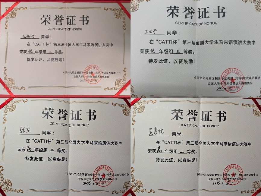 此次成绩的取得凝聚了四位参赛选手的付出与太阳成集团tyc122cc马来语专业教学团队的心血。余俊轩、成茗、文清三位教师及外籍专家Hawa Shukri全程参与备赛,提供专业指导与个性化辅导,从内容构思到语言润色,从表达技巧到舞台表现,不断打磨、精益求精,助力员工将语言学习成果转化为打动人心的演讲作品。