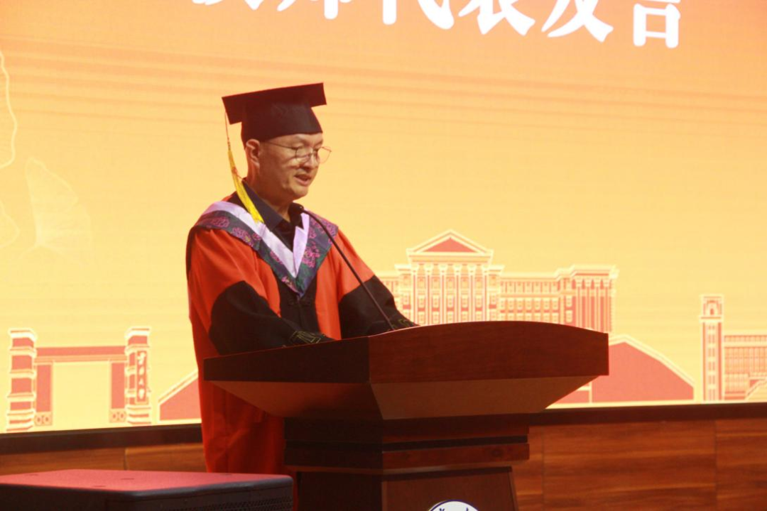 教师代表王宗老师上台致辞。他激励外院学子以奋斗之精神为动力,以理想之志向为引领,怀抱对文学的持续热忱与对文化深沉的尊敬,为中华民族伟大复兴贡献己力。
